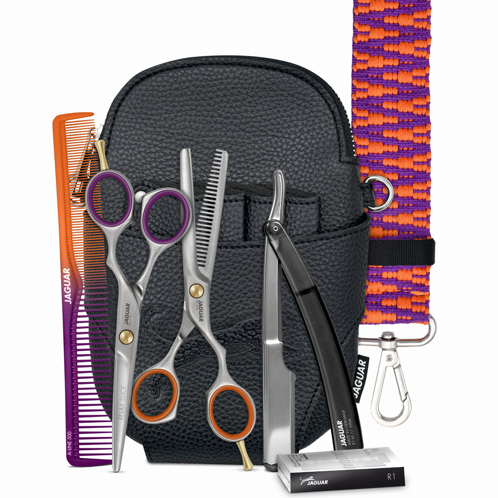 Professionelle Haarscheren der JAGUAR PRE STYLE Range aus Spezialstahl für sehr gute, andauernde Schärfe. Wahlweise in drei verschiedenen Griffvarianten erhältlich. Alle Sets beinhalten: Professionelle Haar- und Modellierschere JAGUAR PRE STYLE Rasierklingenmesser R1 M BLACK mit Metallklingenhalter für Standard-Rasierklingen Inkl. 10 Klingen R1 Haarschneidekamm A-LINE BICOLOR 7.25"" CROSSBAG (Holster), Format: B 14,5 x H 21,5 x T 3 cm.