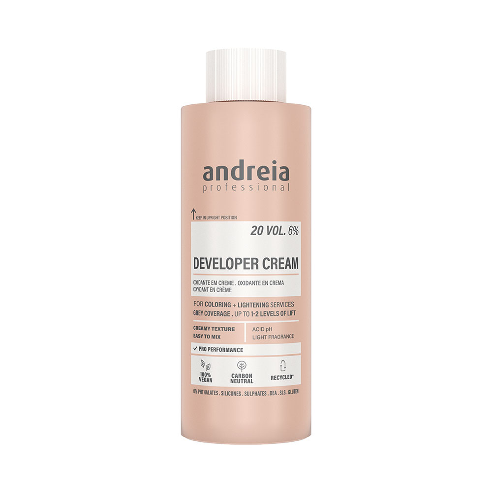 Die vegane DEVELOPER CREAM von Andreia Professional ist unverzichtbar für professionelle Colorationen und Blondierungen. Frei von tierischen Inhaltsstoffen sorgt die cremige Textur für einfaches Mischen, geschmeidiges Auftragen und gleichmäßige Ergebnisse – für leuchtende Farben und präzise Aufhellung. Der saure pH-Wert trägt dazu bei, das natürliche Gleichgewicht und die Gesundheit des Haares während des chemischen Prozesses zu bewahren.