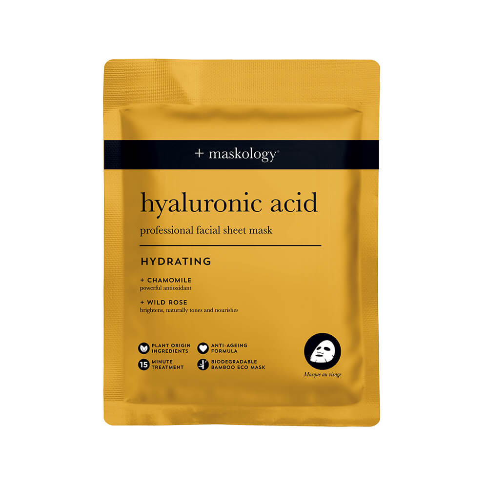 Die +maskology HYALURONIC ACID Professional Sheet Mask verwendet ausschließlich natürliche Inhaltsstoffe, um Feuchtigkeit kraftvoll einzuschließen und die Haut tief zu pflegen. Mit der Kraft von Sojabohnen und Kamille wird die Formel den Teint heilen, hydratisieren und aufhellen.