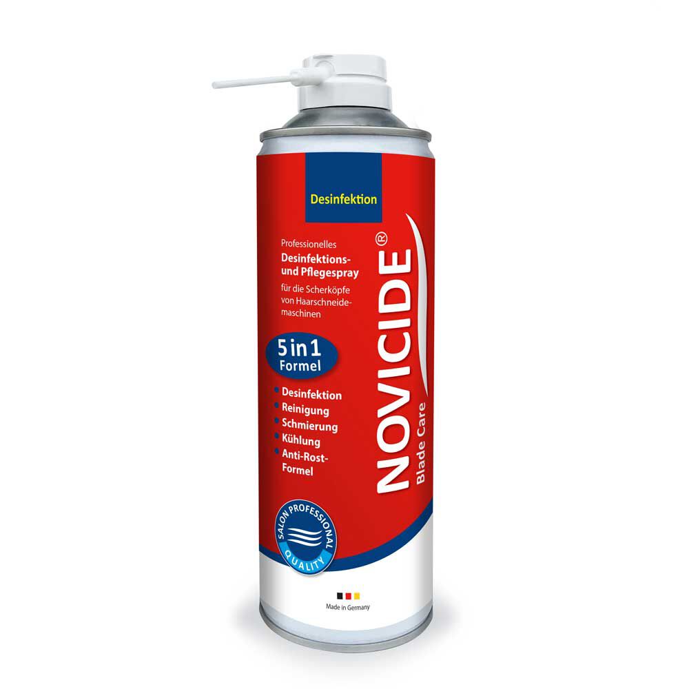 "Desinfektion von Haarschneidemaschinen und Scheren ● Desinfizieren ● Reinigen ● Schmieren ● Kühlen ● Rost zu verhindern Nur den Scherkopf mit NOVICIDE Blade Care einsprühen und 3 Minuten feucht halten. Der Sprühdruck bläst Haare und Ablagerungen zwischen den Zähnen der Messer heraus. Regelmäßige Anwendung verlängert die Lebensdauer der Messer und liefert ein schärferes Schneideerlebnis. Blade Care sollte nach jedem Kunden angewendet werden um die Übertragung von Infektionen zu stoppen. "
